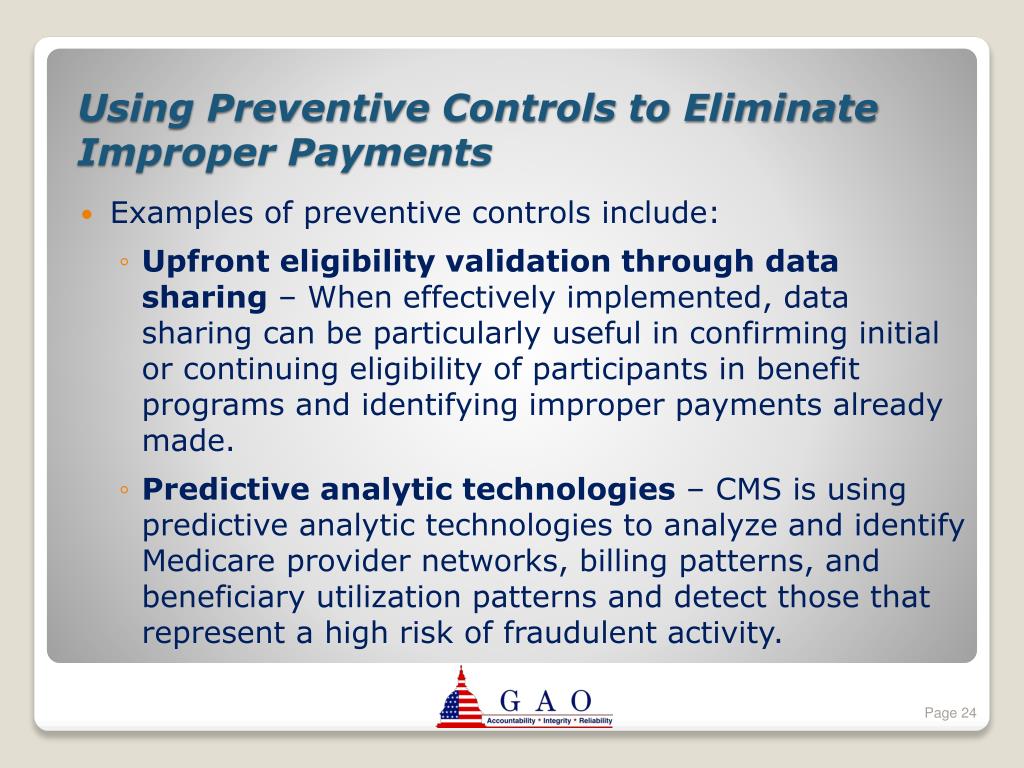 Examples of preventive controls include: • Upfront eligibility validation through data sharing – When effectively implemented, data sharing can be particularly useful in confirming initial or continuing eligibility of participants in benefit programs and identifying improper payments already made. • Predictive analytic technologies – CMS is using predictive analytic technologies to analyze and identify Medicare provider networks, billing patterns, and beneficiary utilization patterns and detect those that represent a high risk of fraudulent activity. Using Preventive Controls to Eliminate Improper Payments