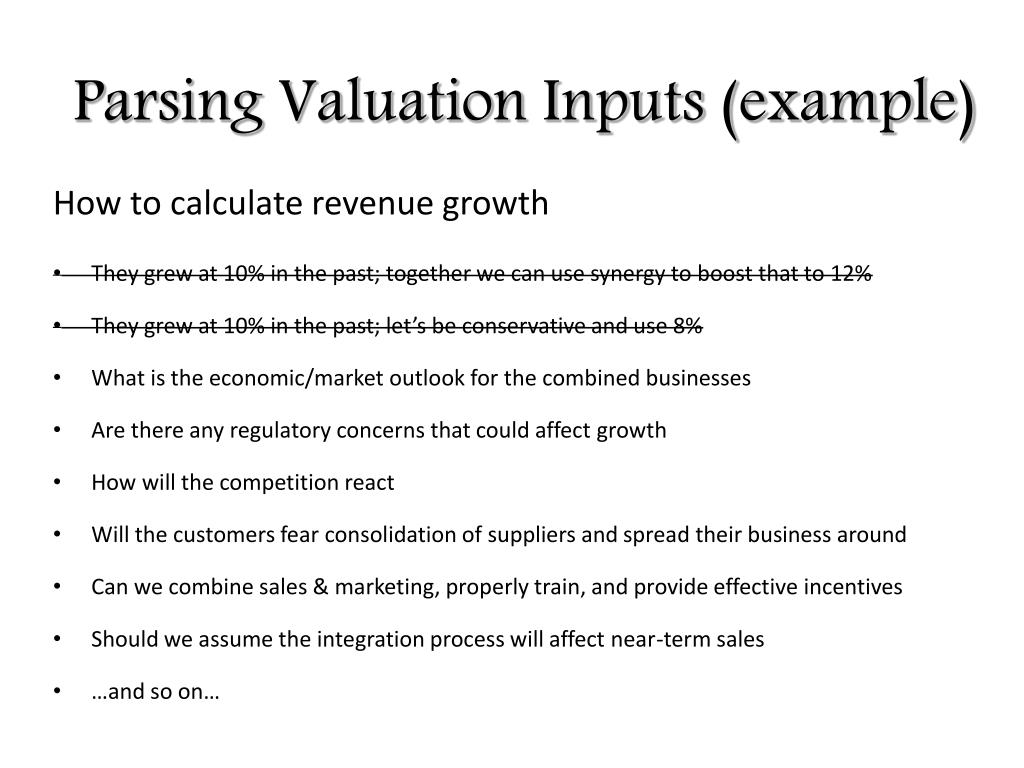 Parsing Valuation Inputs (example) How to calculate revenue growth • They grew at 10% in the past; together we can use synergy to boost that to 12% • They grew at 10% in the past; let’s be conservative and use 8% • What is the economic/market outlook for the combined businesses • Are there any regulatory concerns that could affect growth • How will the competition react • Will the customers fear consolidation of suppliers and spread their business around • Can we combine sales & marketing, properly train, and provide effective incentives • Should we assume the integration process will affect near-term sales • …and so on…