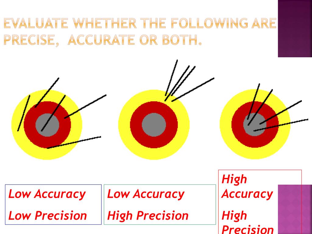 Evaluate whether the following are precise, accurate or both. High Accuracy High Precision Low Accuracy Low Precision Low Accuracy High Precision