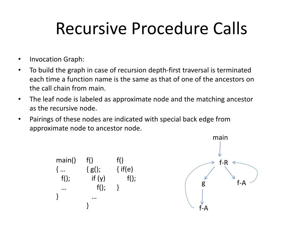 Recursive Procedure Calls • Invocation Graph: • To build the graph in case of recursion depth-first traversal is terminated each time a function name is the same as that of one of the ancestors on the call chain from main. • The leaf node is labeled as approximate node and the matching ancestor as the recursive node. • Pairings of these nodes are indicated with special back edge from approximate node to ancestor node. main main() { … f(); … } f() { g(); if (y) f(); … } f() { if(e) f(); } f-R g f-A f-A