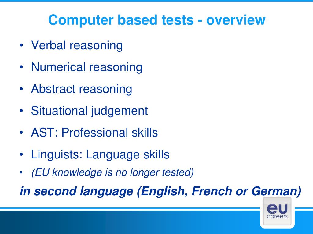 Computer based tests - overview Verbal reasoning Numerical reasoning Abstract reasoning Situational judgement AST: Professional skills Linguists: Language skills (EU knowledge is no longer tested) in second language (English, French or German)