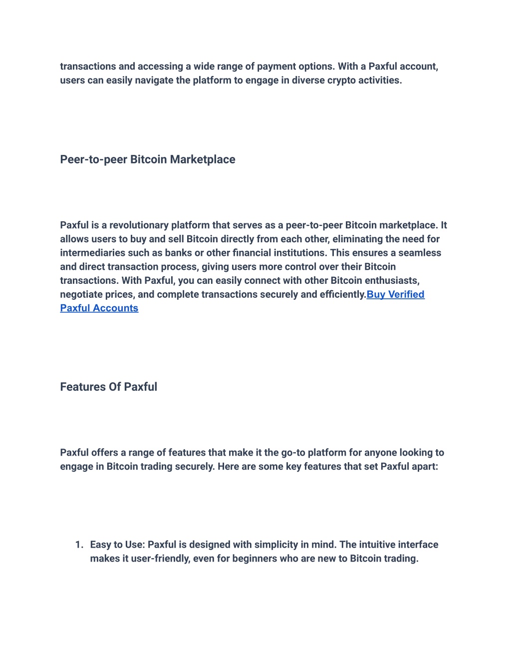 transactions and accessing a wide range of payment options. With a Paxful account, users can easily navigate the platform to engage in diverse crypto activities. Peer-to-peer Bitcoin Marketplace Paxful is a revolutionary platform that serves as a peer-to-peer Bitcoin marketplace. It allows users to buy and sell Bitcoin directly from each other, eliminating the need for intermediaries such as banks or other financial institutions. This ensures a seamless and direct transaction process, giving users more control over their Bitcoin transactions. With Paxful, you can easily connect with other Bitcoin enthusiasts, negotiate prices, and complete transactions securely and efficiently.Buy Verified Paxful Accounts Features Of Paxful Paxful offers a range of features that make it the go-to platform for anyone looking to engage in Bitcoin trading securely. Here are some key features that set Paxful apart: 1. Easy to Use: Paxful is designed with simplicity in mind. The intuitive interface makes it user-friendly, even for beginners who are new to Bitcoin trading.