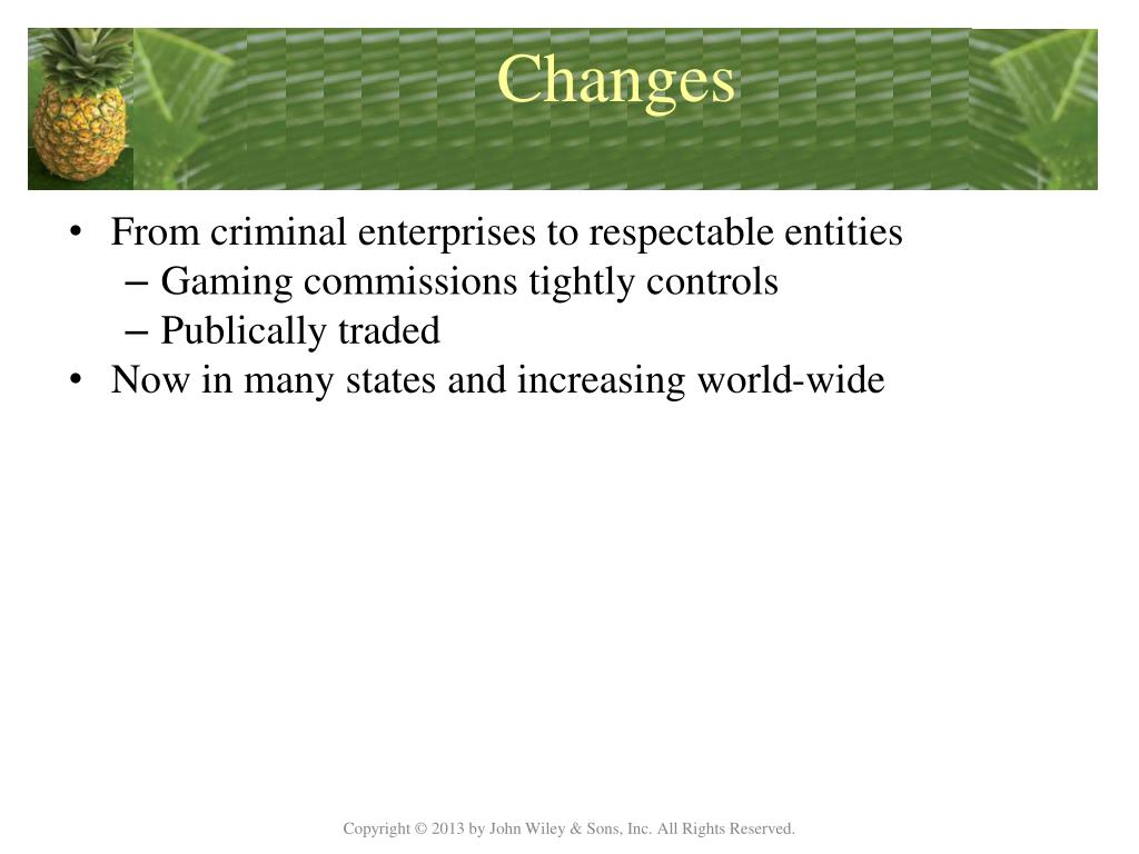 Changes • From criminal enterprises to respectable entities • Gaming commissions tightly controls • Publically traded • Now in many states and increasing world-wide