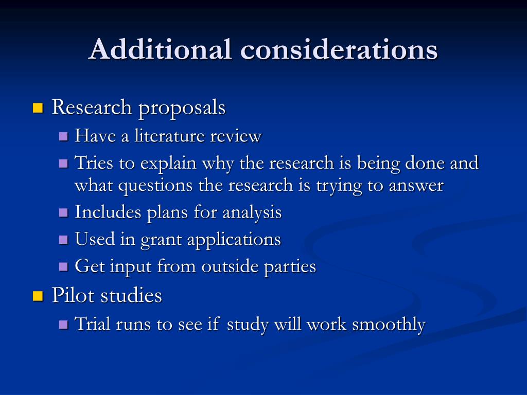 Additional considerations • Research proposals • Have a literature review • Tries to explain why the research is being done and what questions the research is trying to answer • Includes plans for analysis • Used in grant applications • Get input from outside parties • Pilot studies • Trial runs to see if study will work smoothly