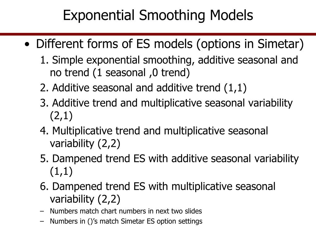 Exponential Smoothing Models • Different forms of ES models (options in Simetar) 1. Simple exponential smoothing, additive seasonal and no trend (1 seasonal ,0 trend) 2. Additive seasonal and additive trend (1,1) 3. Additive trend and multiplicative seasonal variability (2,1) 4. Multiplicative trend and multiplicative seasonal variability (2,2) 5. Dampened trend ES with additive seasonal variability (1,1) 6. Dampened trend ES with multiplicative seasonal variability (2,2) • Numbers match chart numbers in next two slides • Numbers in ()’s match Simetar ES option settings