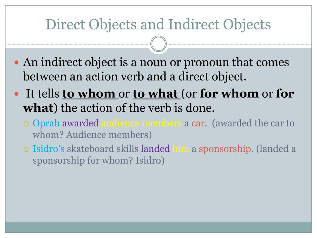 Direct Objects and Indirect Objects • An indirect object is a noun or pronoun that comes between an action verb and a direct object. • It tells to whom or to what (or for whomor for what) the action of the verb is done. • Oprahawardedaudience members a car. (awarded the car to whom? Audience members) • Isidro’s skateboard skills landedhim a sponsorship. (landed a sponsorship for whom? Isidro)