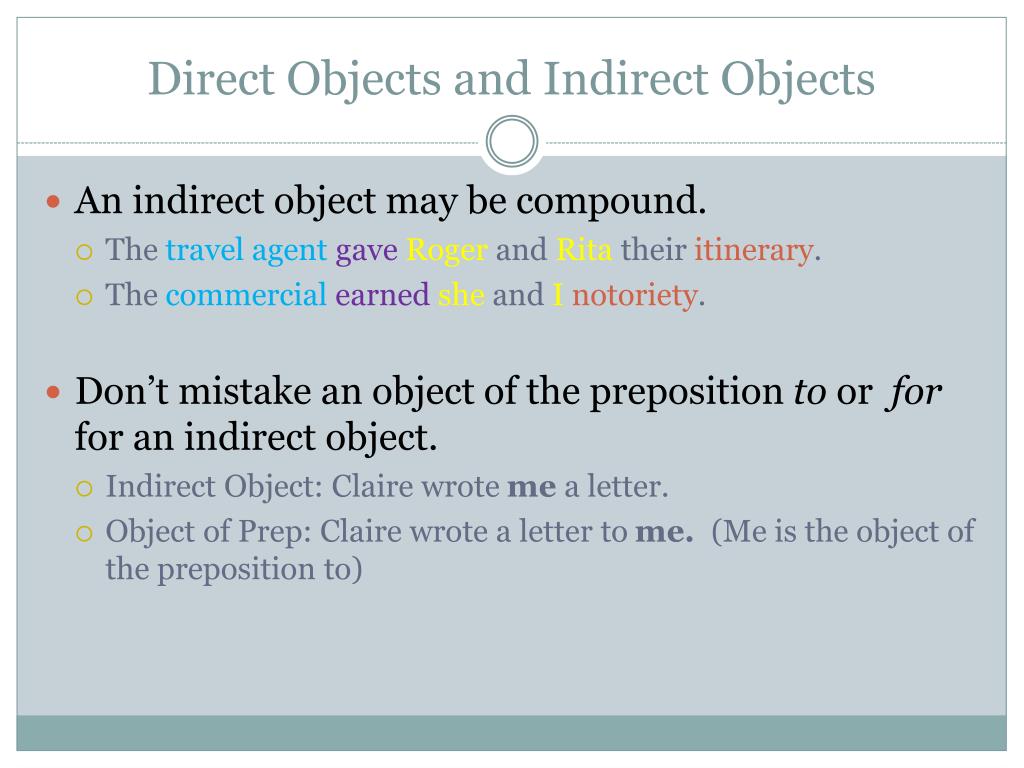 Direct Objects and Indirect Objects • An indirect object may be compound. • The travel agent gaveRoger and Rita their itinerary. • The commercialearnedshe and Inotoriety. • Don’t mistake an object of the preposition to or forfor an indirect object. • Indirect Object: Claire wrote me a letter. • Object of Prep: Claire wrote a letter to me. (Me is the object of the preposition to)