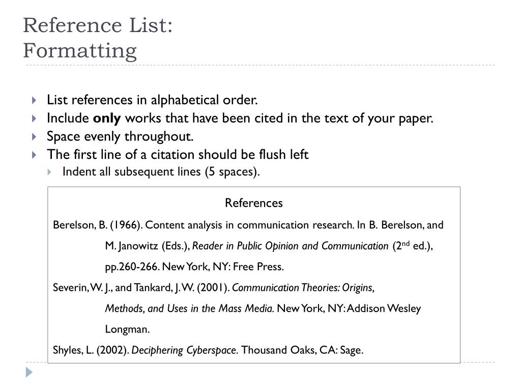 Reference List: Formatting • List references in alphabetical order. • Include only works that have been cited in the text of your paper. • Space evenly throughout. • The first line of a citation should be flush left • Indent all subsequent lines (5 spaces). References Berelson, B. (1966). Content analysis in communication research. In B.Berelson, and M. Janowitz (Eds.), Reader in Public Opinion and Communication (2nd ed.), pp.260-266. New York, NY: Free Press. Severin, W. J., and Tankard, J. W. (2001). Communication Theories: Origins, Methods, and Uses in the Mass Media. New York, NY: Addison Wesley Longman. Shyles, L. (2002). Deciphering Cyberspace. Thousand Oaks, CA: Sage.