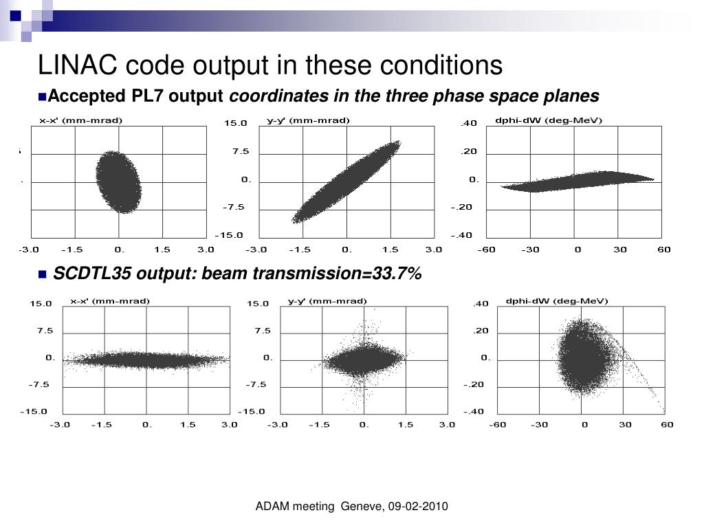 LINAC code output in these conditions • Accepted PL7 output coordinates in the three phase space planes • SCDTL35 output: beam transmission=33.7% ADAM meeting Geneve, 09-02-2010