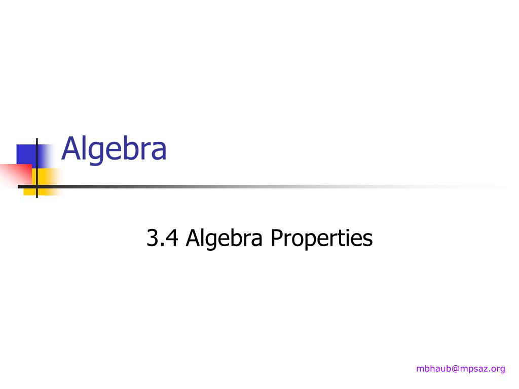 Algebra. 3.4 Algebra Properties. mbhaub@mpsaz.org. Goals. Use properties from algebra. Use properties to justify statements. Algebra Properties. Don’t copy all of this down You have had most before. Copy the ones that are new to you You need to have them all memorized.
