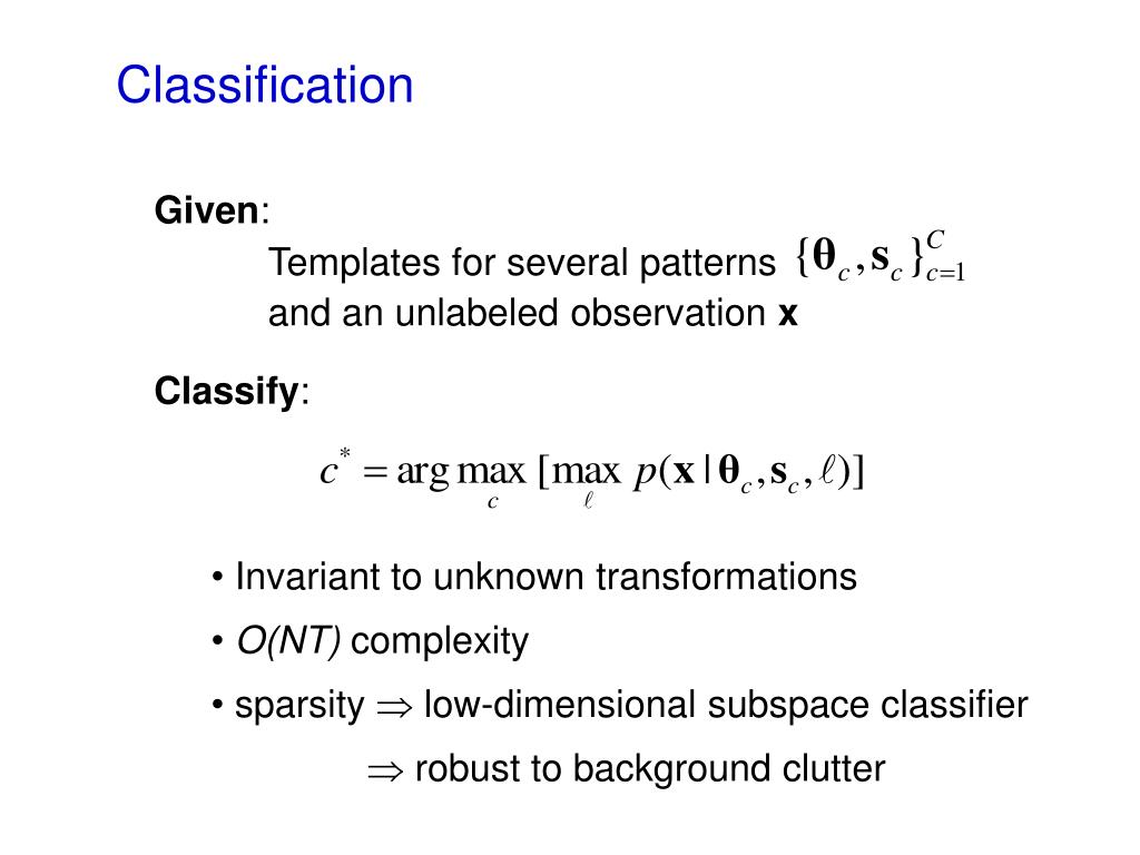 Classification Given: Templates for several patterns and an unlabeled observation x Classify: • Invariant to unknown transformations • O(NT) complexity • sparsity low-dimensional subspace classifier • robust to background clutter