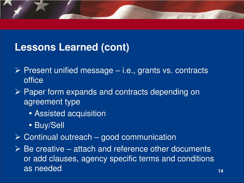 Lessons Learned (cont) • Present unified message – i.e., grants vs. contracts office • Paper form expands and contracts depending on agreement type • Assisted acquisition • Buy/Sell • Continual outreach – good communication • Be creative – attach and reference other documents or add clauses, agency specific terms and conditions as needed