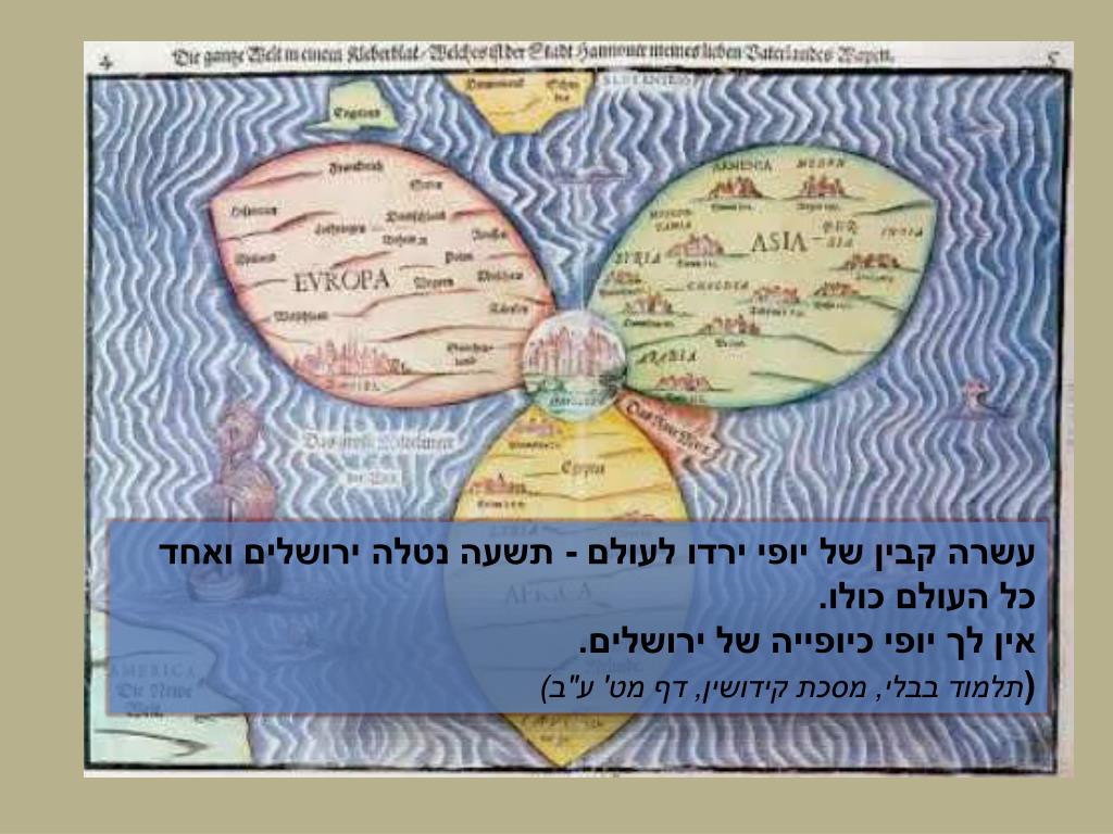 עשרה קבין של יופי ירדו לעולם - תשעה נטלה ירושלים ואחד כל העולם כולו. אין לך יופי כיופייה של ירושלים. ( תלמוד בבלי, מסכת קידושין, דף מט' ע"ב). "כשם שטבור הזה נתון באמצע האיש , כך ארץ ישראל טבורה של עולם. ארץ ישראל יושבת באמצעיתו של עולם, וירושלים באמצע ארץ ישראל ,