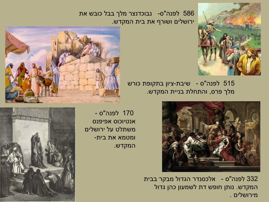 586 לפנה"ס- נבוכדנצר מלך בבל כובש את ירושלים ושורף את בית המקדש. 515 לפנה"ס - שיבת-ציון בתקופת כורש מלך פרס, והתחלת בניית המקדש. 170 לפנה"ס - אנטיוכוסאפיפנס משתלט על ירושלים ומטמא את בית-המקדש. 332 לפנה"ס - אלכסנדר הגדול מבקר בבית המקדש. נותן חופש דת לשמעון כהן גדול מירושלים .