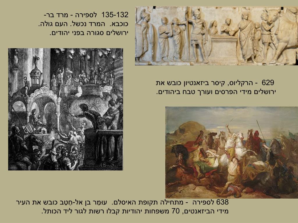 135-132 לספירה - מרד בר-כוכבא. המרד נכשל. העם גולה. ירושלים סגורה בפני יהודים. 629 - הרקליוס, קיסר ביזאנטיון כובש את ירושלים מידי הפרסים ועורך טבח ביהודים. 638 לספירה - מתחילה תקופת האיסלם. עוּמַר בן אל-חַטַב כובש את העיר מידי הביזאנטים, 70 משפחות יהודיות קבלו רשות לגור ליד הכותל.