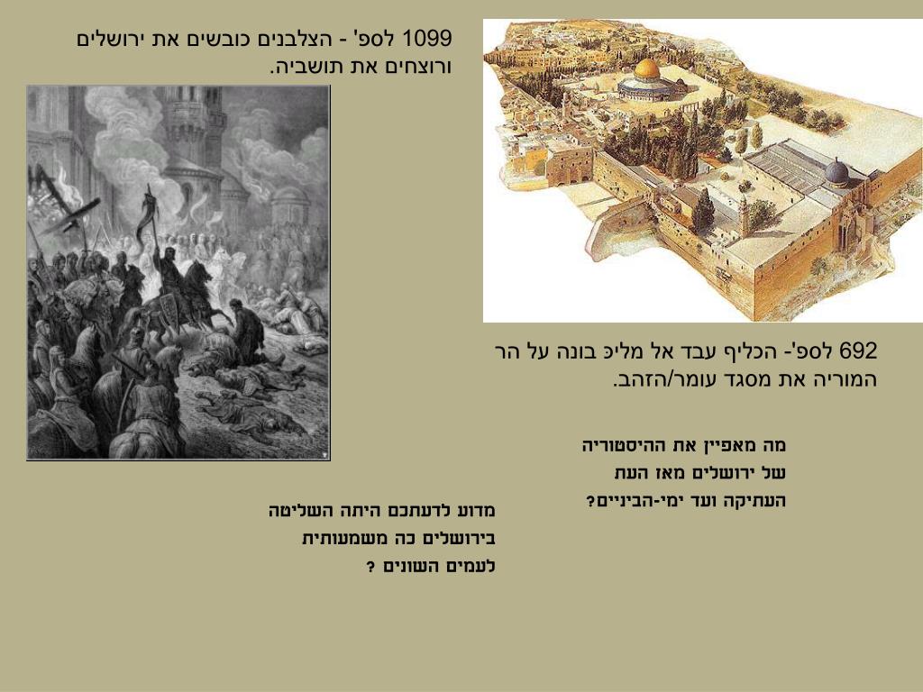 1099 לספ' - הצלבנים כובשים את ירושלים ורוצחים את תושביה. 692 לספ'- הכליף עבד אל מליכּ בונה על הר המוריה את מסגד עומר/הזהב. מה מאפיין את ההיסטוריה של ירושלים מאז העת העתיקה ועד ימי-הביניים? מדוע לדעתכם היתה השליטה בירושלים כה משמעותית לעמים השונים ?