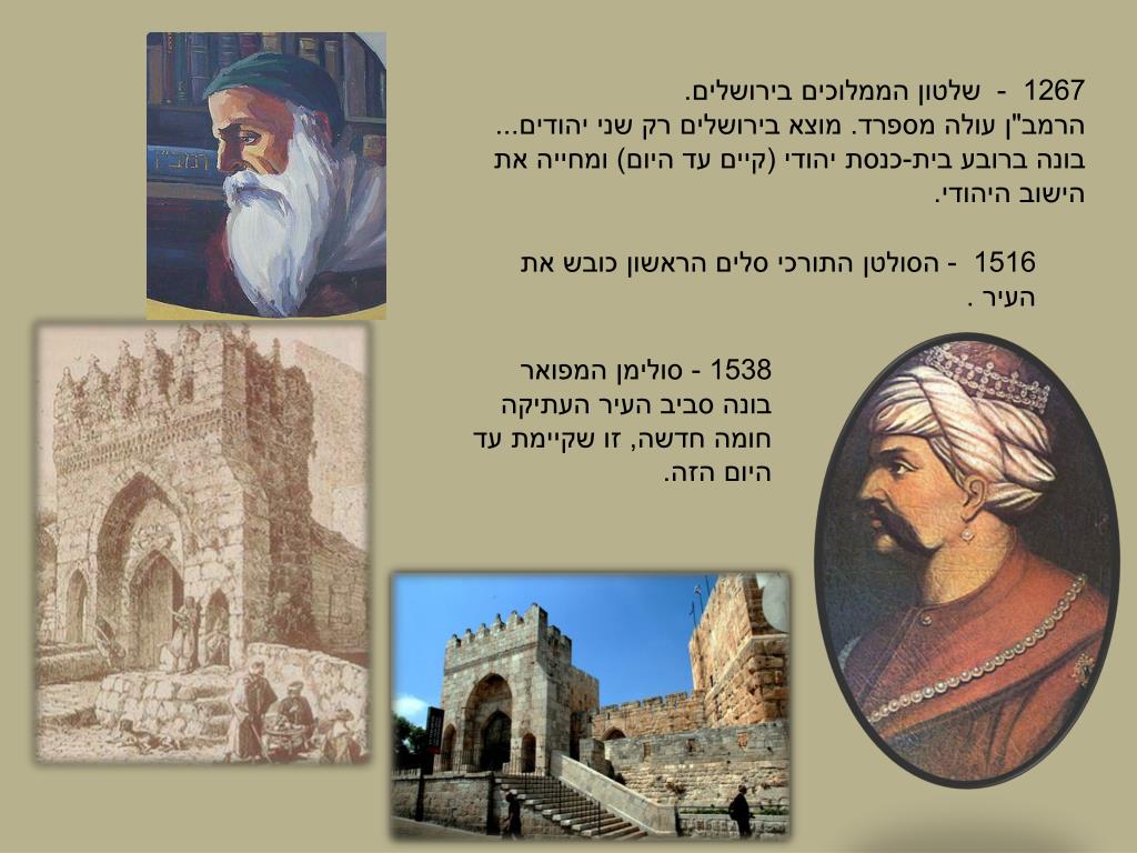 1267 - שלטון הממלוכים בירושלים. הרמב"ן עולה מספרד. מוצא בירושלים רק שני יהודים... בונה ברובע בית-כנסת יהודי (קיים עד היום) ומחייה את הישוב היהודי. 1516 - הסולטן התורכי סלים הראשון כובש את העיר . 1538 - סולימן המפואר בונה סביב העיר העתיקה חומה חדשה, זו שקיימת עד היום הזה.