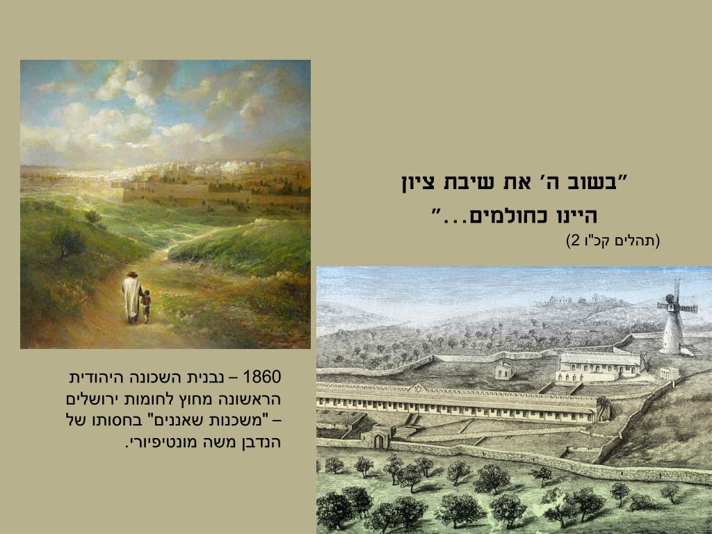 "בשוב ה' את שיבת ציון היינו כחולמים…" (תהלים קכ"ו 2) 1860 – נבנית השכונה היהודית הראשונה מחוץ לחומות ירושלים – "משכנות שאננים" בחסותו של הנדבן משה מונטיפיורי.