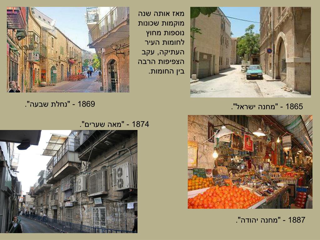 מאז אותה שנה מוקמות שכונות נוספות מחוץ לחומות העיר העתיקה, עקב הצפיפות הרבה בין החומות. 1869 - "נחלת שבעה". 1865 - "מחנה ישראל". 1874 - "מאה שערים". 1887 - "מחנה יהודה".