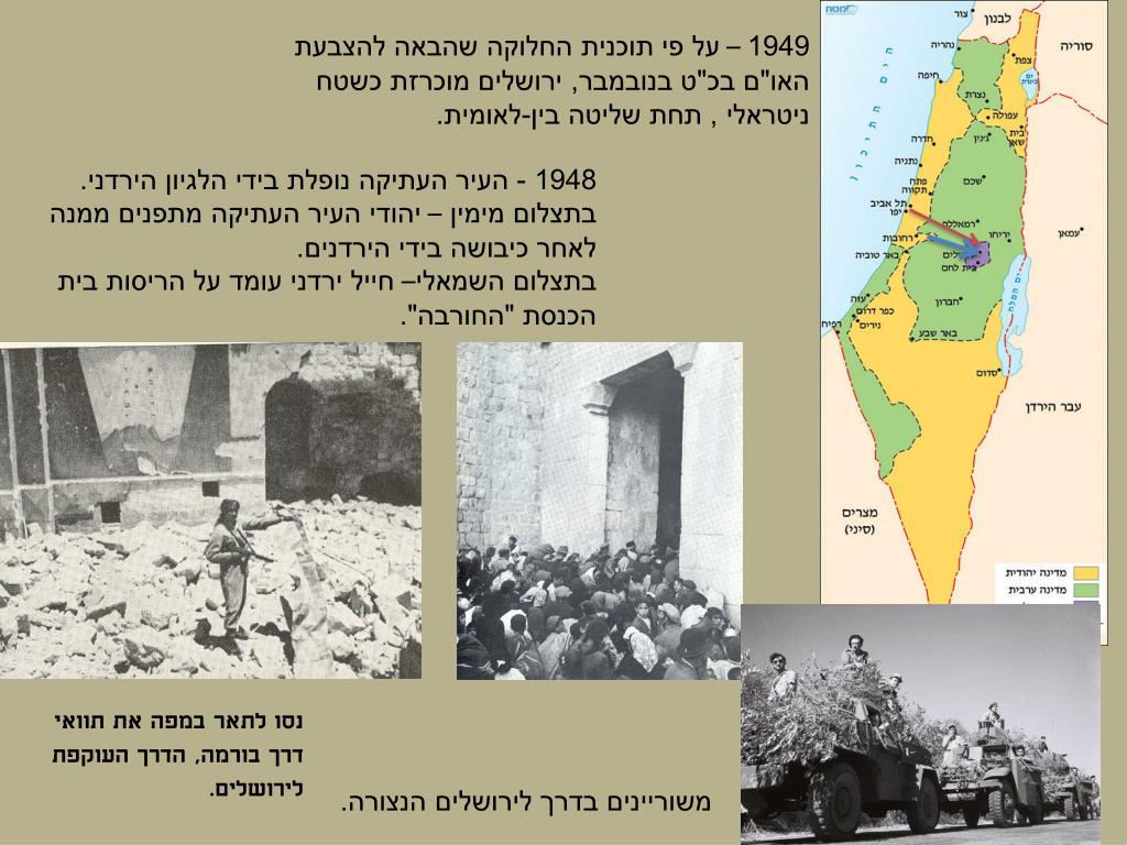 1949 – על פי תוכנית החלוקה שהבאה להצבעת האו"ם בכ"ט בנובמבר, ירושלים מוכרזת כשטח ניטראלי , תחת שליטה בין-לאומית. 1948 - העיר העתיקה נופלת בידי הלגיון הירדני. בתצלום מימין – יהודי העיר העתיקה מתפנים ממנה לאחר כיבושה בידי הירדנים. בתצלום השמאלי– חייל ירדני עומד על הריסות בית הכנסת "החורבה". נסו לתאר במפה את תוואי דרך בורמה, הדרך העוקפת לירושלים. משוריינים בדרך לירושלים הנצורה.
