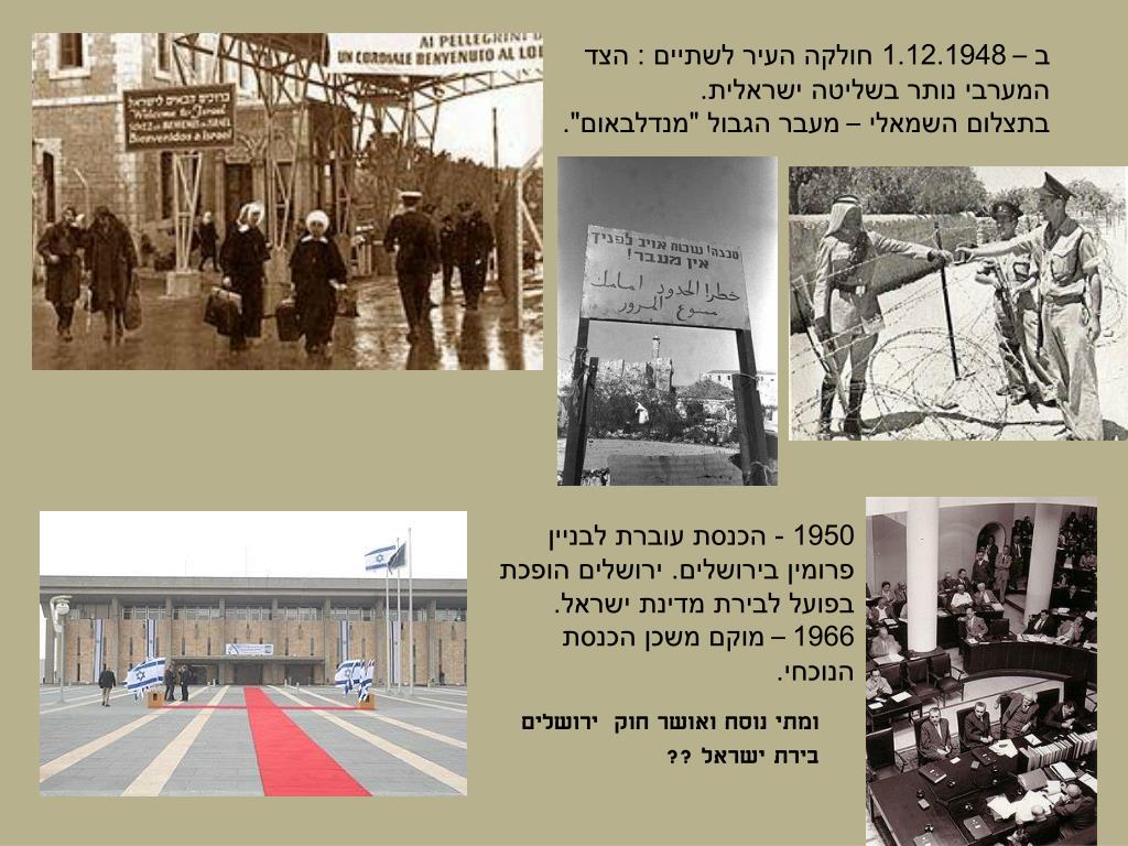ב – 1.12.1948 חולקה העיר לשתיים : הצד המערבי נותר בשליטה ישראלית. בתצלום השמאלי – מעבר הגבול "מנדלבאום". 1950 - הכנסת עוברת לבניין פרומין בירושלים. ירושלים הופכת בפועל לבירת מדינת ישראל. 1966 – מוקם משכן הכנסת הנוכחי. ומתי נוסח ואושר חוק ירושלים בירת ישראל ??