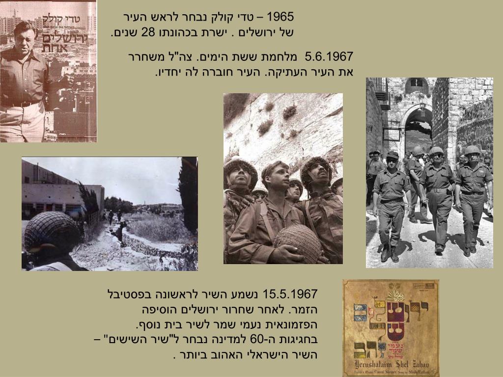 1965 – טדי קולק נבחר לראש העיר של ירושלים . ישרת בכהונתו 28 שנים. 5.6.1967 מלחמת ששת הימים. צה"ל משחרר את העיר העתיקה. העיר חוברה לה יחדיו. 15.5.1967 נשמע השיר לראשונה בפסטיבל הזמר. לאחר שחרור ירושלים הוסיפה הפזמונאית נעמי שמר לשיר בית נוסף. בחגיגות ה-60 למדינה נבחר ל"שיר השישים" – השיר הישראלי האהוב ביותר .