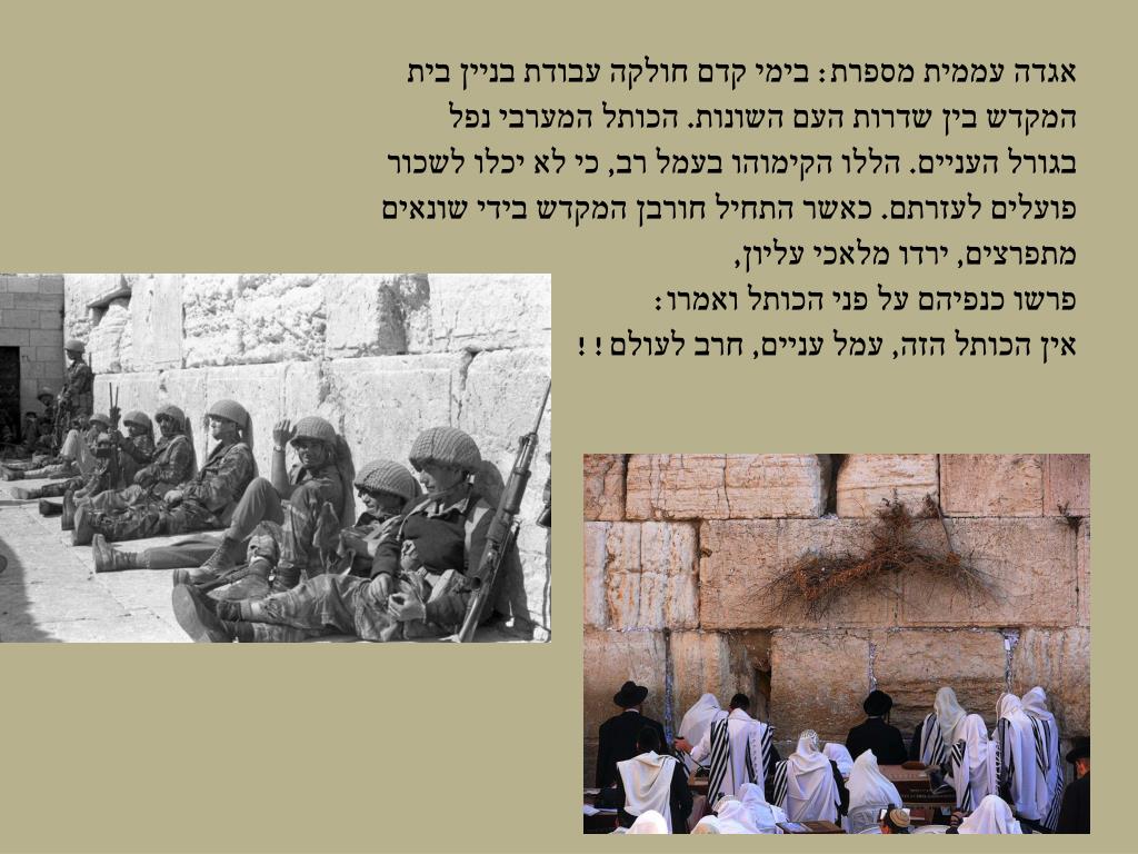 אגדה עממית מספרת: בימי קדם חולקה עבודת בניין בית המקדש בין שדרות העם השונות. הכותל המערבי נפל בגורל העניים. הללו הקימוהו בעמל רב, כי לא יכלו לשכור פועלים לעזרתם. כאשר התחיל חורבן המקדש בידי שונאים מתפרצים, ירדו מלאכי עליון,פרשו כנפיהם על פני הכותל ואמרו: אין הכותל הזה, עמל עניים, חרב לעולם!!