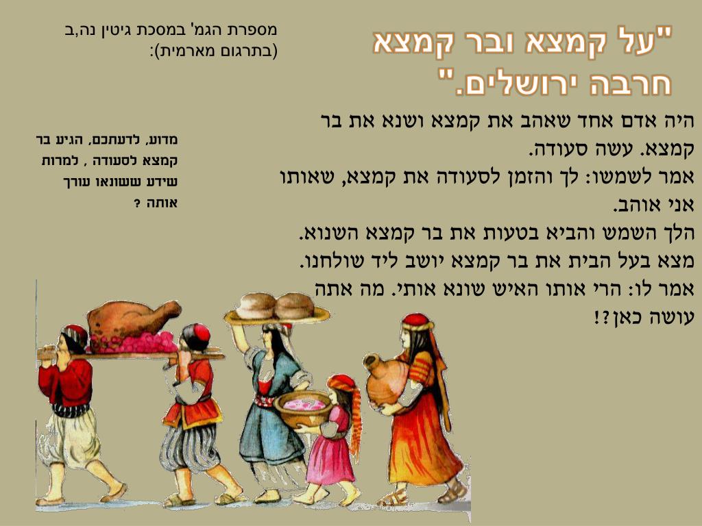 מספרת הגמ' במסכת גיטין נה,ב (בתרגום מארמית): "על קמצא ובר קמצא חרבה ירושלים." היה אדם אחד שאהב את קמצא ושנא את בר קמצא. עשה סעודה. אמר לשמשו: לך והזמן לסעודה את קמצא, שאותו אני אוהב.הלך השמש והביא בטעות את בר קמצא השנוא. מצא בעל הבית את בר קמצא יושב ליד שולחנו. אמר לו: הרי אותו האיש שונא אותי. מה אתה עושה כאן?! מדוע, לדעתכם, הגיע בר קמצא לסעודה , למרות שידע ששונאו עורך אותה ?