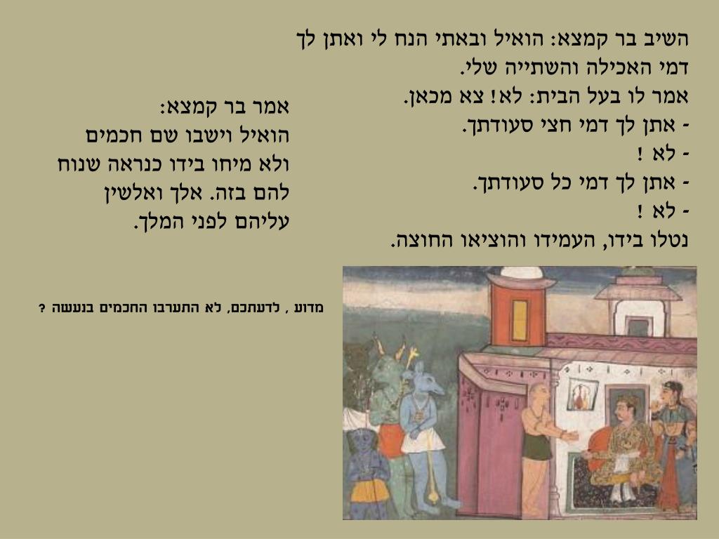השיב בר קמצא: הואיל ובאתי הנח לי ואתן לך דמי האכילה והשתייה שלי.אמר לו בעל הבית: לא! צא מכאן.- אתן לך דמי חצי סעודתך.- לא !- אתן לך דמי כל סעודתך.- לא !נטלו בידו, העמידו והוציאו החוצה. אמר בר קמצא: הואיל וישבו שם חכמים ולא מיחו בידו כנראה שנוח להם בזה. אלך ואלשין עליהם לפני המלך. מדוע , לדעתכם, לא התערבו החכמים בנעשה ?