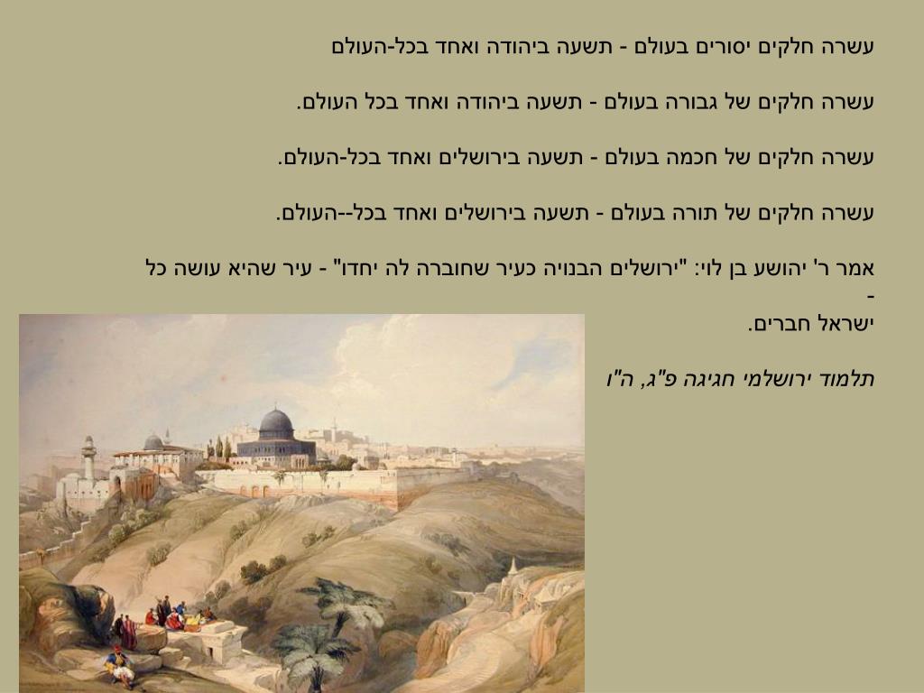עשרה חלקים יסורים בעולם - תשעה ביהודה ואחד בכל-העולםעשרה חלקים של גבורה בעולם - תשעה ביהודה ואחד בכל העולם.עשרה חלקים של חכמה בעולם - תשעה בירושלים ואחד בכל-העולם.עשרה חלקים של תורה בעולם - תשעה בירושלים ואחד בכל--העולם.אמר ר' יהושע בן לוי: "ירושלים הבנויה כעיר שחוברה לה יחדו" - עיר שהיא עושה כל -ישראל חברים.תלמוד ירושלמי חגיגה פ"ג, ה"ו