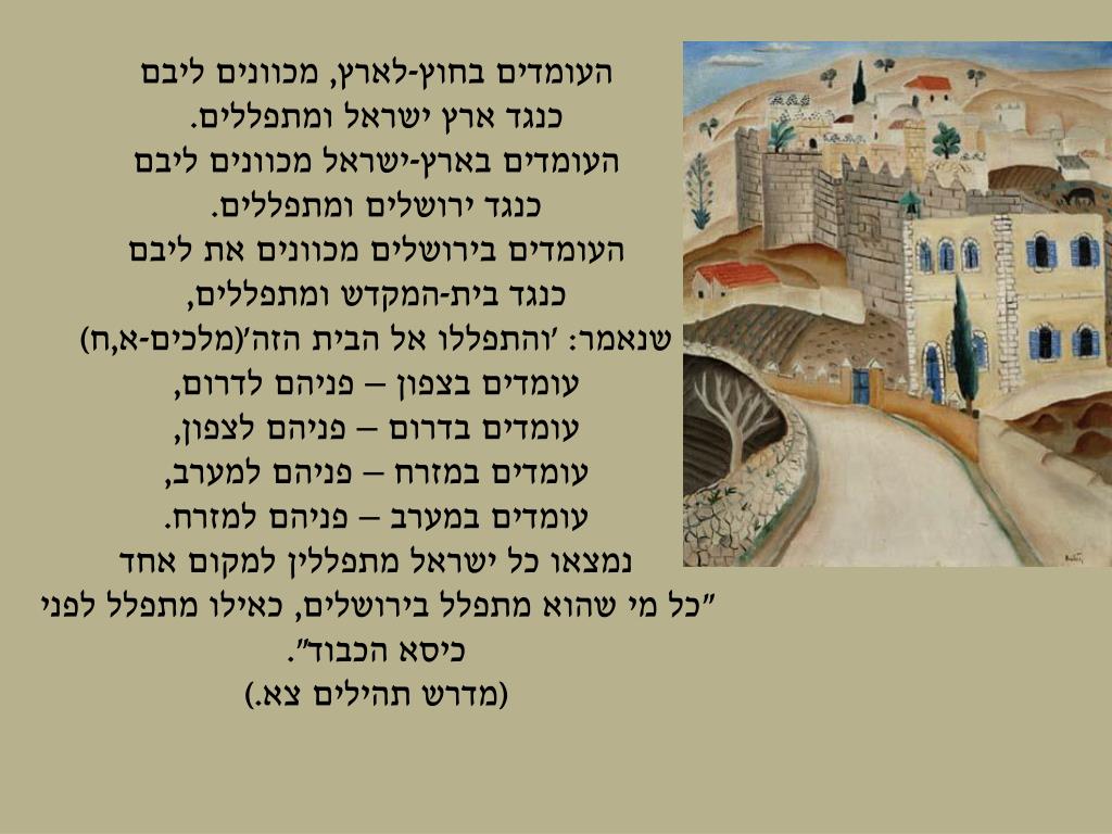 העומדים בחוץ-לארץ, מכוונים ליבם כנגד ארץ ישראל ומתפללים. העומדים בארץ-ישראל מכוונים ליבם כנגד ירושלים ומתפללים. העומדים בירושלים מכוונים את ליבם כנגד בית-המקדש ומתפללים, שנאמר: 'והתפללו אל הבית הזה'(מלכים-א,ח) עומדים בצפון – פניהם לדרום, עומדים בדרום – פניהם לצפון, עומדים במזרח – פניהם למערב, עומדים במערב – פניהם למזרח. נמצאו כל ישראל מתפללין למקום אחד "כל מי שהוא מתפלל בירושלים, כאילו מתפלל לפני כיסא הכבוד". (מדרש תהילים צא.)