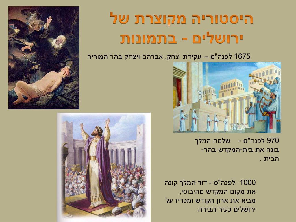 היסטוריה מקוצרת של ירושלים - בתמונות 1675 לפנה"ס – עקידת יצחק, אברהם ויצחק בהר המוריה 970 לפנה"ס - שלמה המלך בונה את בית-המקדש בהר-הבית . 1000 לפנה"ס - דוד המלך קונה את מקום המקדש מהיבוסי, מביא את ארון הקודש ומכריז על ירושלים כעיר הבירה.