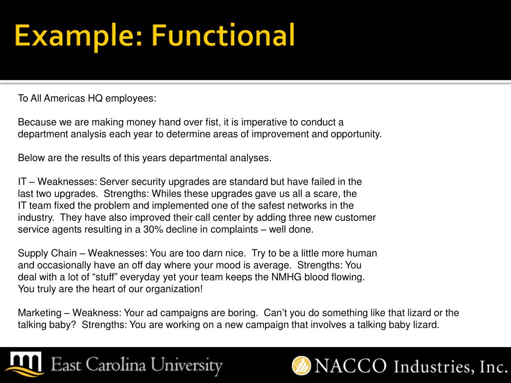 Example: Functional To All Americas HQ employees: Because we are making money hand over fist, it is imperative to conduct a department analysis each year to determine areas of improvement and opportunity. Below are the results of this years departmental analyses. IT – Weaknesses: Server security upgrades are standard but have failed in the last two upgrades. Strengths: Whiles these upgrades gave us all a scare, the IT team fixed the problem and implemented one of the safest networks in the industry. They have also improved their call center by adding three new customer service agents resulting in a 30% decline in complaints – well done. Supply Chain – Weaknesses: You are too darn nice. Try to be a little more human and occasionally have an off day where your mood is average. Strengths: You deal with a lot of “stuff” everyday yet your team keeps the NMHG blood flowing. You truly are the heart of our organization! Marketing – Weakness: Your ad campaigns are boring. Can’t you do something like that lizard or the talking baby? Strengths: You are working on a new campaign that involves a talking baby lizard.