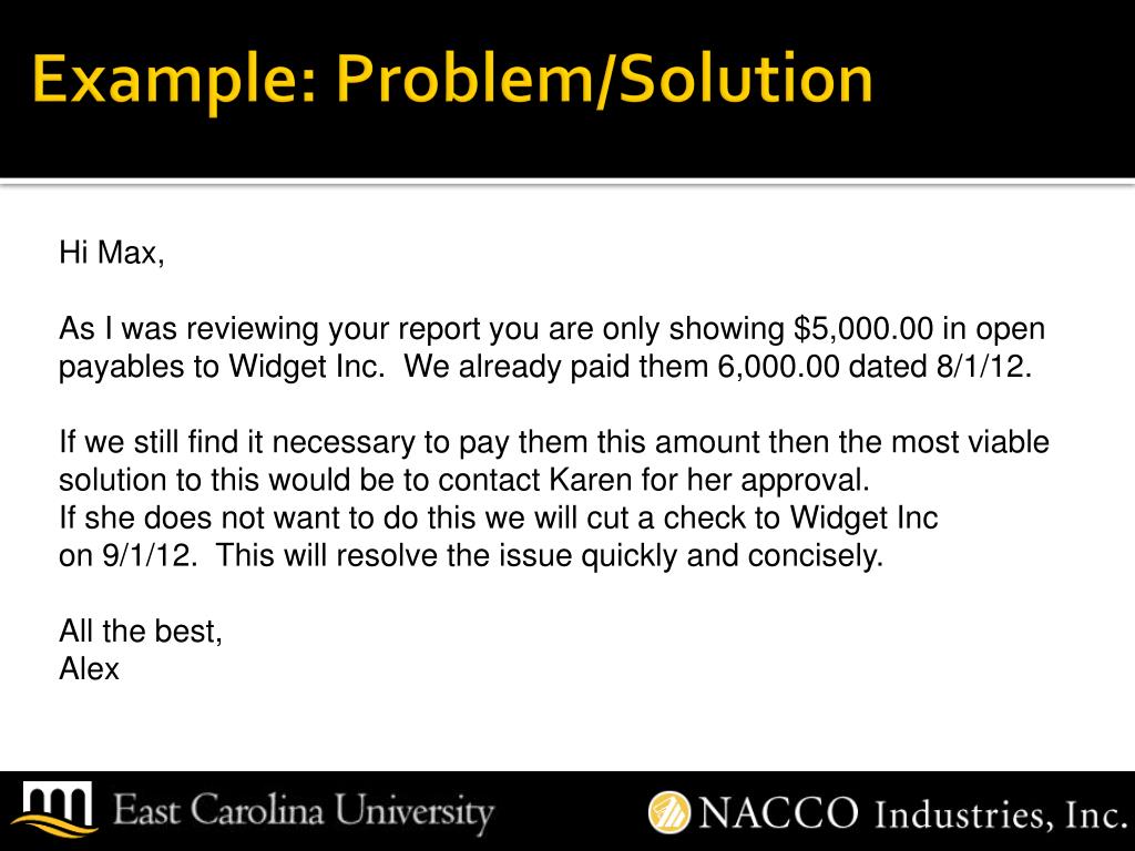Example: Problem/Solution Hi Max, As I was reviewing your report you are only showing $5,000.00 in open payables to Widget Inc. We already paid them 6,000.00 dated 8/1/12. If we still find it necessary to pay them this amount then the most viable solution to this would be to contact Karen for her approval. If she does not want to do this we will cut a check to Widget Inc on 9/1/12. This will resolve the issue quickly and concisely. All the best, Alex