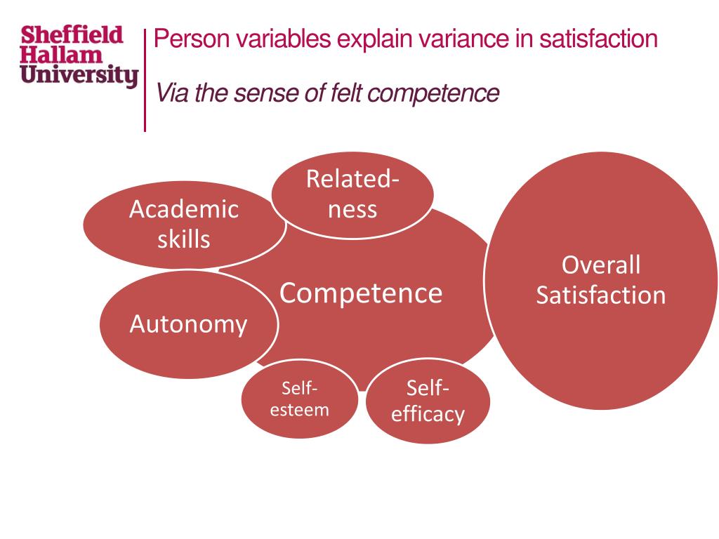 Person variables explain variance in satisfaction • Overall Satisfaction Via the sense of felt competence • Related-ness • Academic skills • Competence • Autonomy • Self-efficacy • Self-esteem