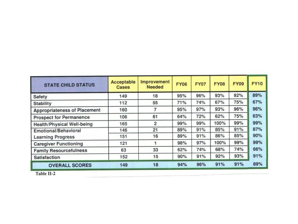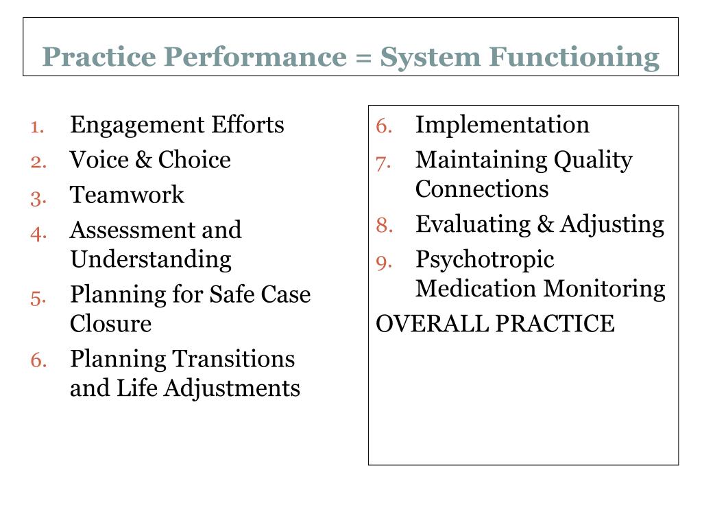 Practice Performance = System Functioning • Engagement Efforts • Voice & Choice • Teamwork • Assessment and Understanding • Planning for Safe Case Closure • Planning Transitions and Life Adjustments Implementation Maintaining Quality Connections Evaluating & Adjusting Psychotropic Medication Monitoring OVERALL PRACTICE