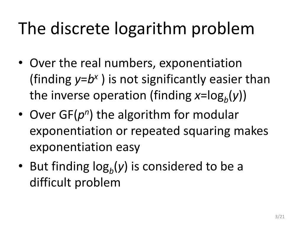 The discrete logarithm problem • Over the real numbers, exponentiation (finding y=bx ) is not significantly easier than the inverse operation (finding x=logb(y)) • Over GF(pn) the algorithm for modular exponentiation or repeated squaring makes exponentiation easy • But finding logb(y) is considered to be a difficult problem