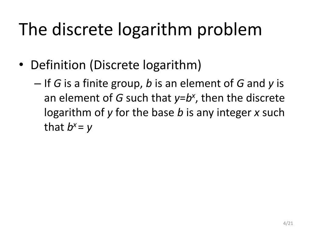 The discrete logarithm problem • Definition (Discrete logarithm) • If G is a finite group, b is an element of G and y is an element of G such that y=bx, then the discrete logarithm of y for the base b is any integer x such that bx= y