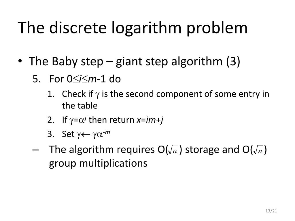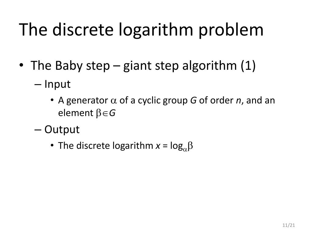 The discrete logarithm problem • The Baby step – giant step algorithm (1) • Input • A generator of a cyclic group G of order n, and an element G • Output • The discrete logarithm x = log