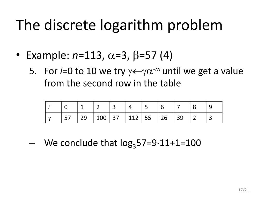 The discrete logarithm problem • Example: n=113, =3, =57 (4) • For i=0 to 10 we try -m until we get a value from the second row in the table • We conclude that log357=911+1=100