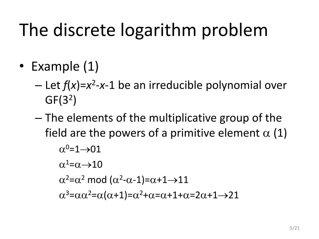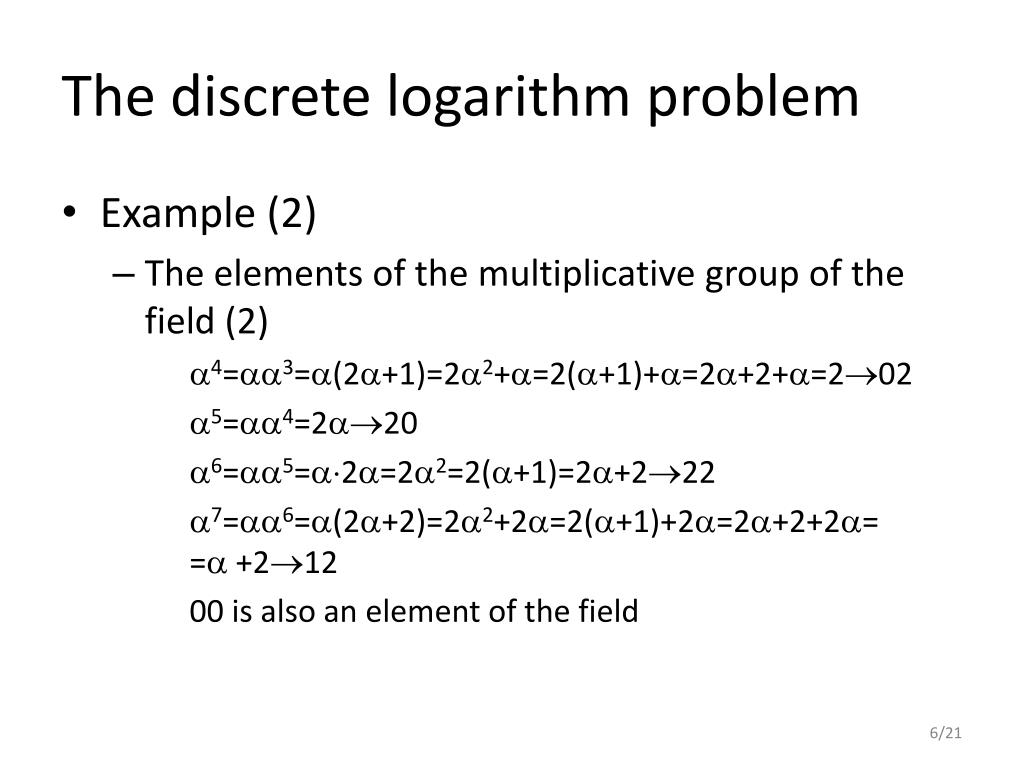 The discrete logarithm problem • Example (2) • The elements of the multiplicative group of the field (2) 4=3=(2+1)=22+=2(+1)+=2+2+=202 5=4=220 6=5=2=22=2(+1)=2+222 7=6=(2+2)=22+2=2(+1)+2=2+2+2= = +212 00 is also an element of the field