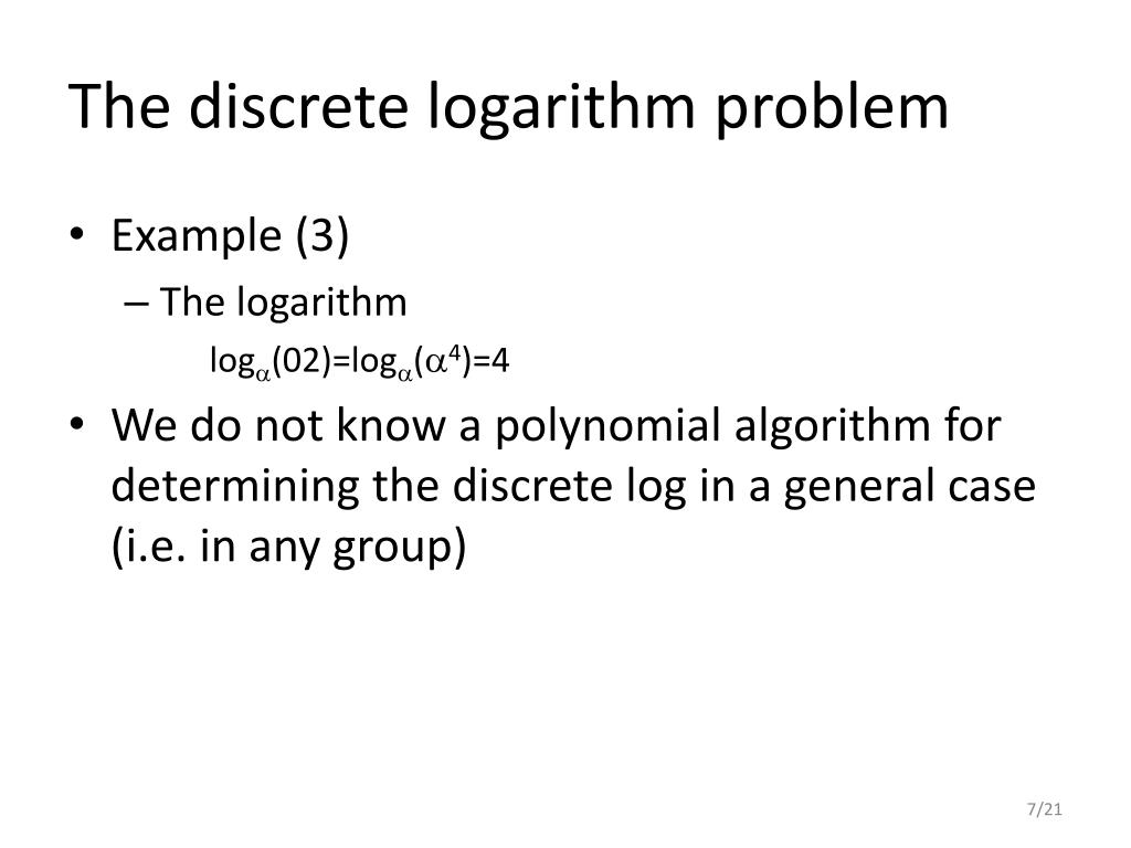The discrete logarithm problem • Example (3) • The logarithm log(02)=log(4)=4 • We do not know a polynomial algorithm for determining the discrete log in a general case (i.e. in any group)