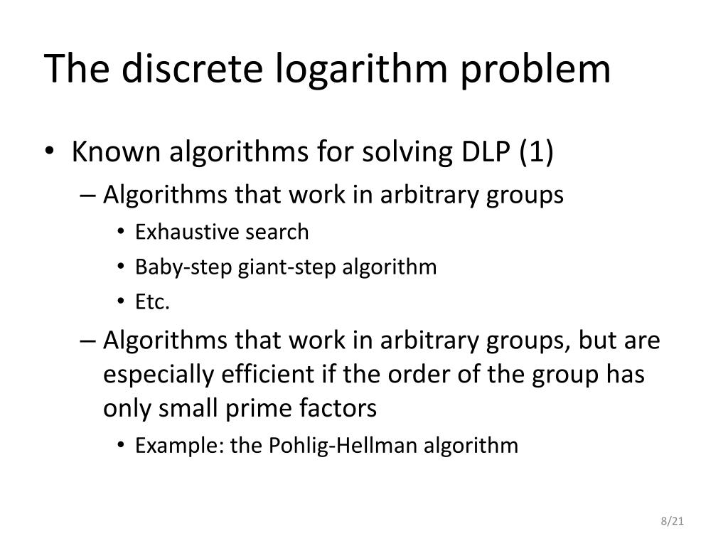 The discrete logarithm problem • Known algorithms for solving DLP (1) • Algorithms that work in arbitrary groups • Exhaustive search • Baby-step giant-step algorithm • Etc. • Algorithms that work in arbitrary groups, but are especially efficient if the order of the group has only small prime factors • Example: the Pohlig-Hellman algorithm
