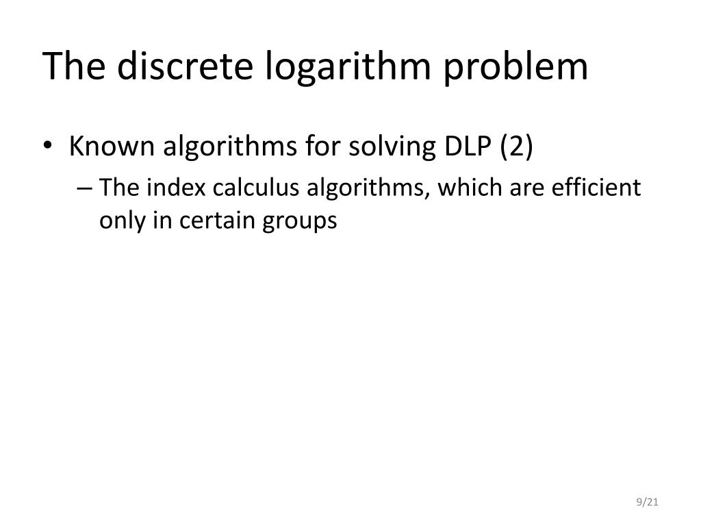 The discrete logarithm problem • Known algorithms for solving DLP (2) • The index calculus algorithms, which are efficient only in certain groups