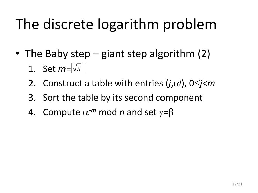 The discrete logarithm problem • The Baby step – giant step algorithm (3) • For 0im-1 do • Check if is the second component of some entry in the table • If =j then return x=im+j • Set -m • The algorithm requires O( ) storage and O( ) group multiplications