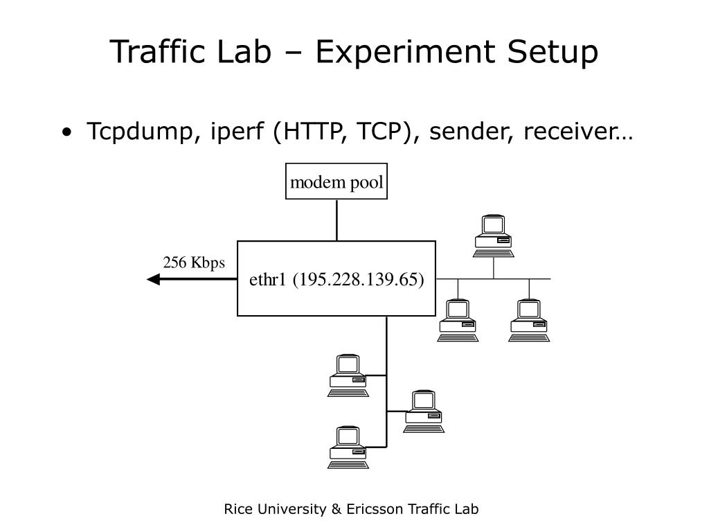 Traffic Lab – Experiment Setup • Tcpdump, iperf (HTTP, TCP), sender, receiver… Rice University & Ericsson Traffic Lab