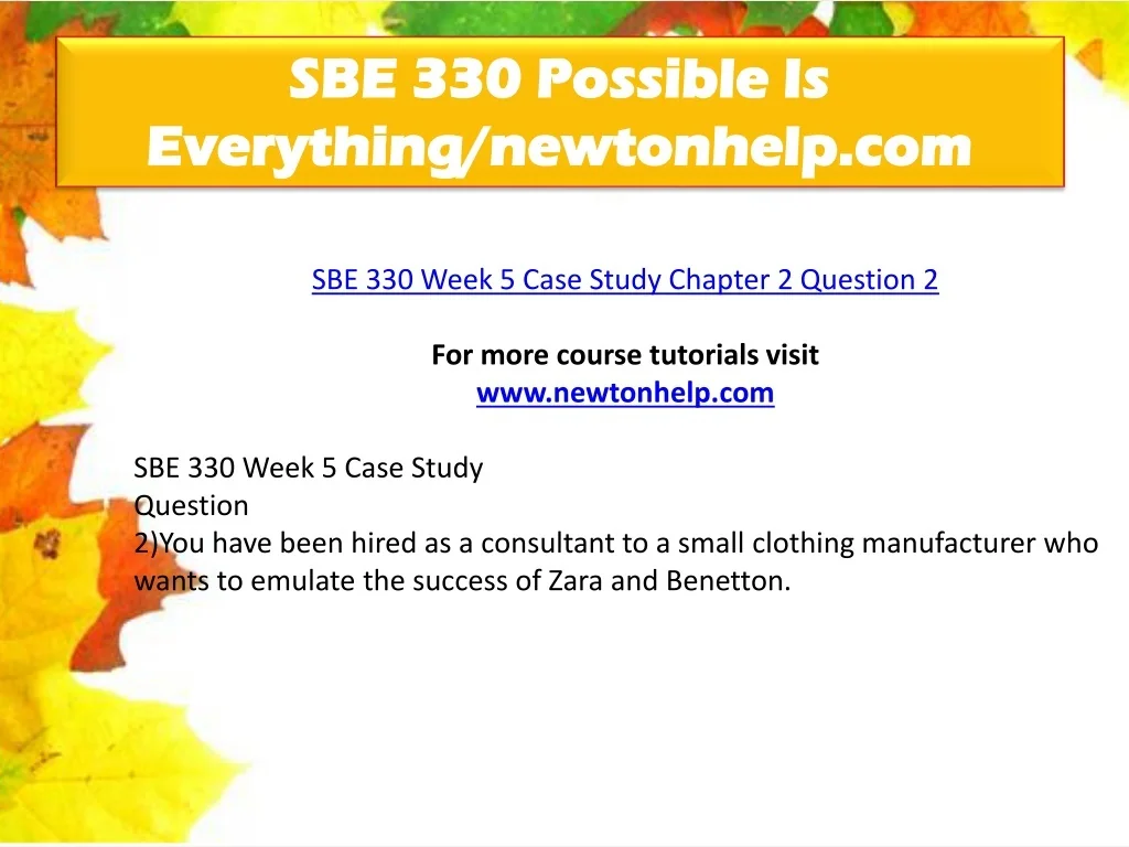 SBE 330 Possible Is Everything/newtonhelp.com SBE 330 Week 5 Case Study Chapter 2 Question 2 For more course tutorials visit www.newtonhelp.com SBE 330 Week 5 Case Study Question 2)You have been hired as a consultant to a small clothing manufacturer who wants to emulate the success of Zara and Benetton.