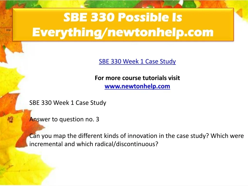 SBE 330 Possible Is Everything/newtonhelp.com SBE 330 Week 1 Case Study For more course tutorials visit www.newtonhelp.com SBE 330 Week 1 Case Study Answer to question no. 3 Can you map the different kinds of innovation in the case study? Which were incremental and which radical/discontinuous?