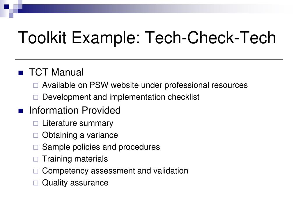 Toolkit Example: Tech-Check-Tech • TCT Manual • Available on PSW website under professional resources • Development and implementation checklist • Information Provided • Literature summary • Obtaining a variance • Sample policies and procedures • Training materials • Competency assessment and validation • Quality assurance